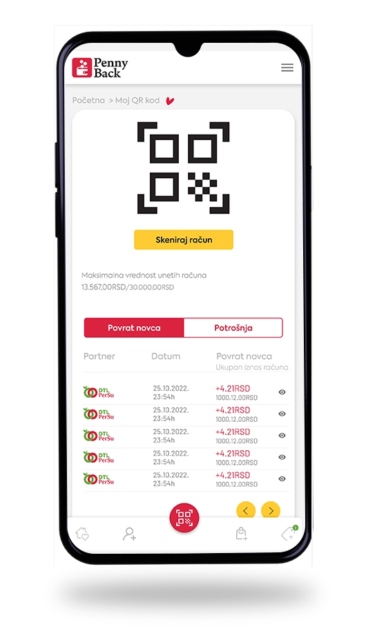 Nema više fizičkog skeniranja PBIK kodova sa računa niti ručnog prekucavanja. Sve se sada obavlja jednostavno: na kasi pokažete QR kod iz aplikacije ili sa otvorene stranice na adresi https://portal.pennyback.rs.